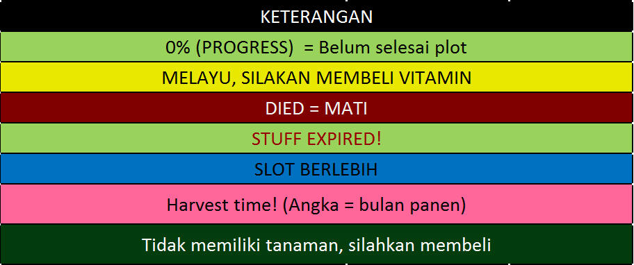 2. Masa valid gardening stuff tidak habis (font merah), tidak layu (kolom kuning) atau tidak mati (kolom merah). Harap perbarui stuff jika akan panen.